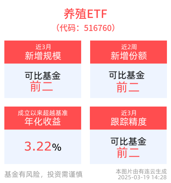 规模方面,养殖ETF近3月规模增长781.17万元,实现显著增长,新增规模位居可比基金2/4。