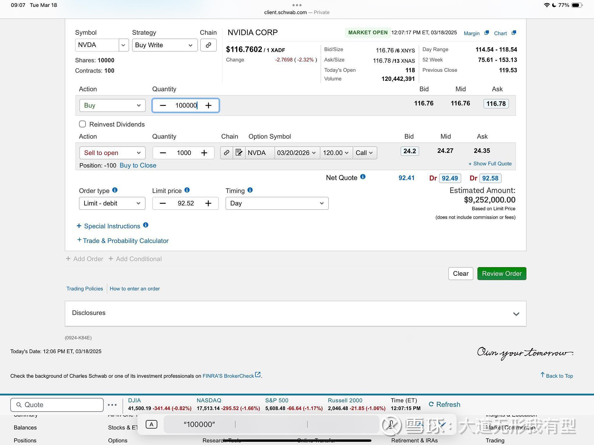 在Buy Write策略中,限价92.52美元不是指以每股92.52美元的价格买入股票,而是整个交易的每股净成本,即减去期权卖出后收入的每股成本。