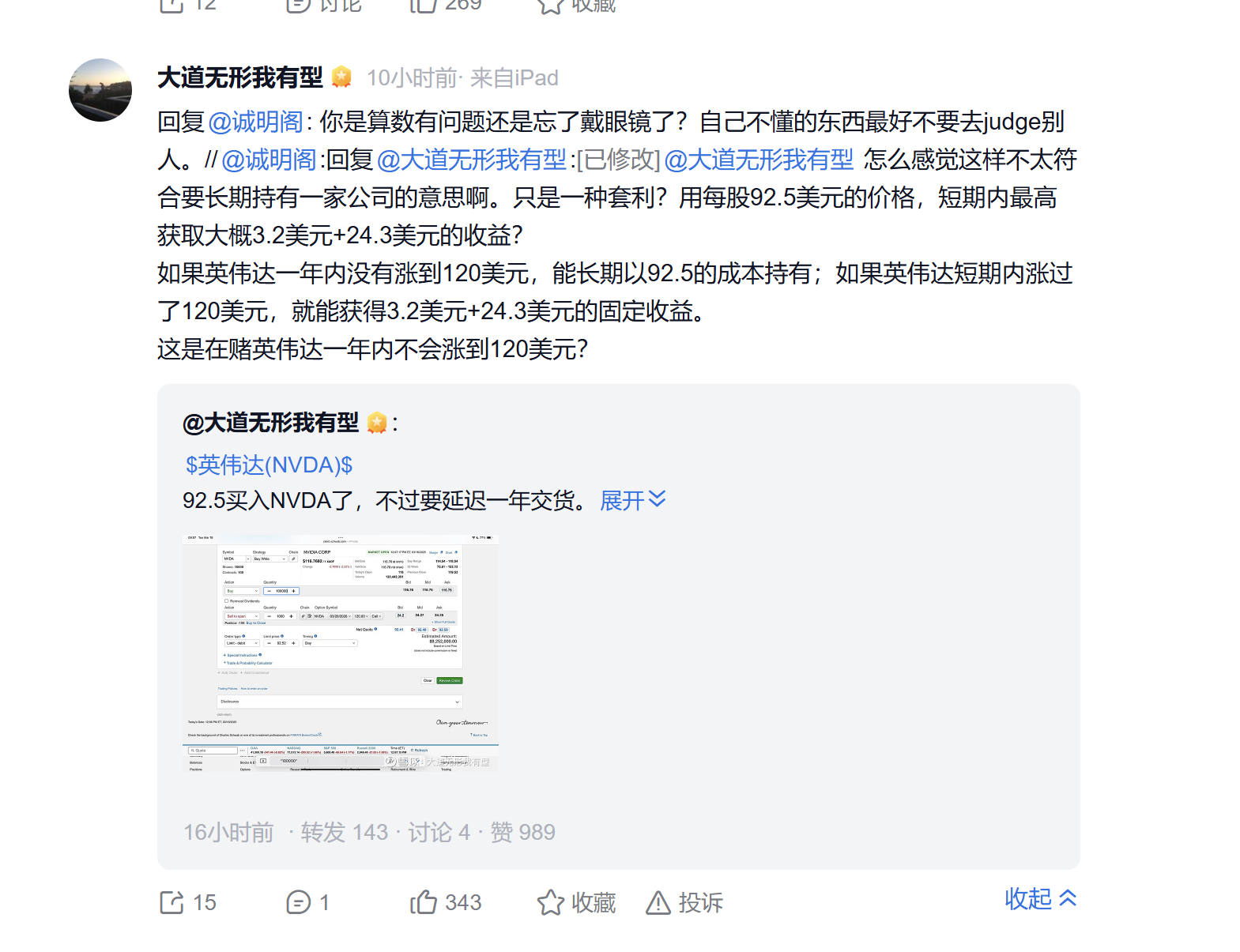 段永平买入10万股英伟达股票的同时,又卖出了这批股票的1000份看涨期权,看涨期权的买方有权在2026年3月20日以120美元的价格买他手上的英伟达股票。