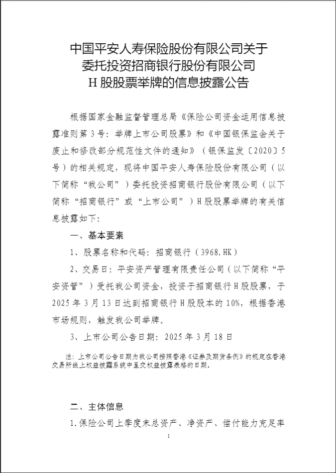 3月19日,中国平安人寿保险股份有限公司(以下简称“平安人寿”)公告,平安资管受托平安人寿资金,投资于招商银行H股股票,于3月13日达到招商银行H股股本的10%。根据香港市场规则,触发平安人寿举牌。