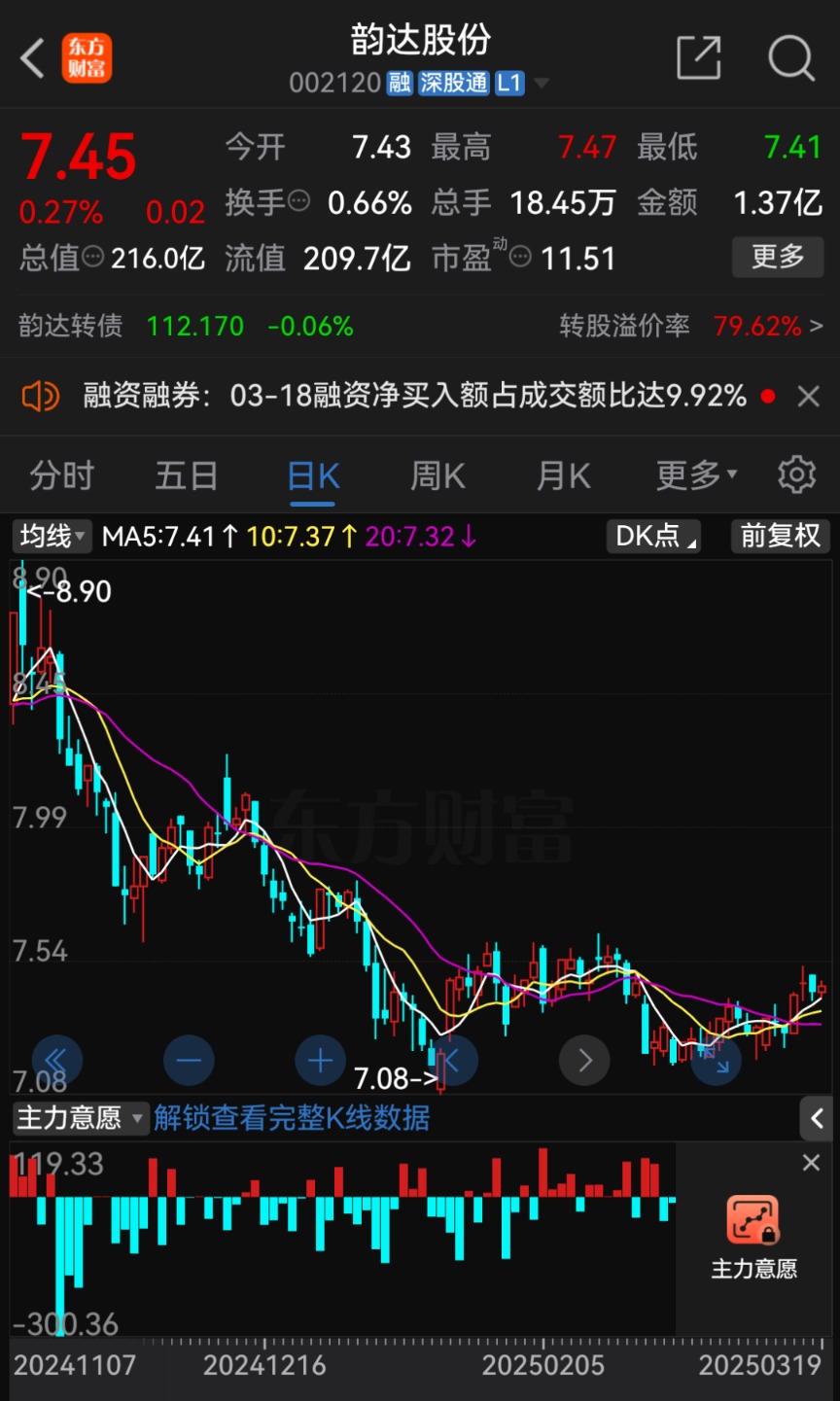 3月19日收盘,韵达股份股价报7.45元/股,总市值为216亿元。