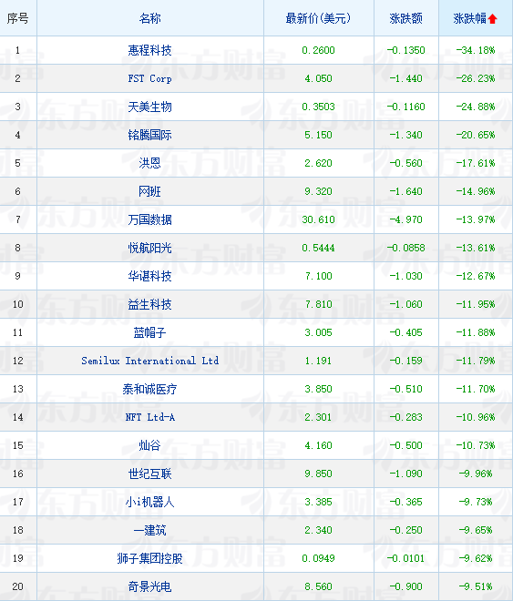 领跌中概股列表: