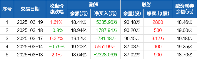 融资方面,当日融资买入3381.9万元,融资偿还8717.86万元,融资净偿还5335.96万元,连续3日净偿还累计7905.38万元。融券方面,融券卖出4000股,融券偿还1200股,融券余量90.48万股,融券余额572.74万元。融资融券余额合计18.46亿元。