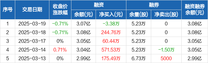 融资方面,当日融资买入749.35万元,融资偿还752.72万元,融资净偿还3.38万元。融券方面,融券卖出0股,融券偿还0股,融券余量5.23万股,融券余额7.27万元。融资融券余额合计3.08亿元。