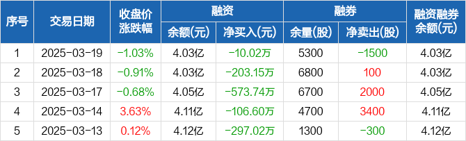 融资方面,当日融资买入926.45万元,融资偿还936.47万元,融资净偿还10.02万元,连续5日净偿还累计1190.53万元。融券方面,融券卖出1900股,融券偿还3400股,融券余量5300股,融券余额4.57万元。融资融券余额合计4.03亿元。