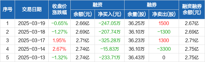 融资方面,当日融资买入582.78万元,融资偿还829.83万元,融资净偿还247.05万元,连续5日净偿还累计1029.61万元。融券方面,融券卖出1500股,融券偿还0股,融券余量36.25万股,融券余额55.83万元。融资融券余额合计2.67亿元。
