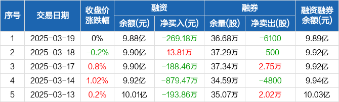 融资方面,当日融资买入423.02万元,融资偿还692.2万元,融资净偿还269.18万元。融券方面,融券卖出300股,融券偿还6400股,融券余量36.68万股,融券余额183.4万元。融资融券余额合计9.89亿元。