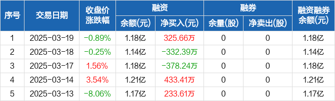 融资方面,当日融资买入1575.6万元,融资偿还1249.94万元,融资净买入325.66万元。融券方面,融券卖出0股,融券偿还0股,融券余量0股,融券余额0元。融资融券余额合计1.18亿元。