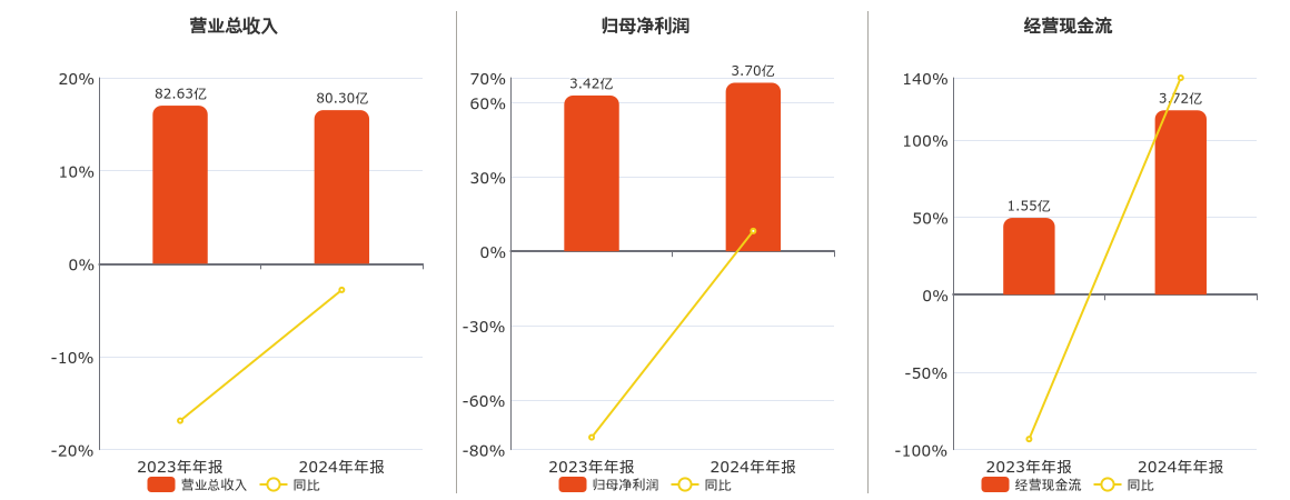 公司营业总收入为80.30亿元。归母净利润为3.70亿元,较去年同报告期归母净利润增加2801.94万元,同比较去年同期上涨8.20%。经营活动现金净流入为3.72亿元,较去年同报告期经营活动现金净流入增加2.17亿元,同比较去年同期上涨139.97%。