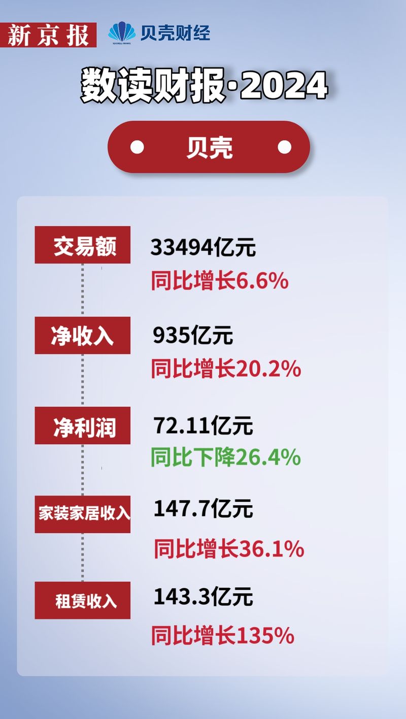 2024年全年,贝壳净收入达到935亿元,同比增长20.2%,总交易额高达33494亿元,增长6.6%。