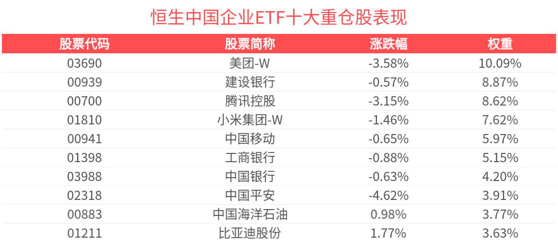 数据显示,截至2025年3月19日,恒生中国企业指数(HSCE)前十大权重股分别为小米集团-W(01810)、阿里巴巴-W(09988)、腾讯控股(00700)、美团-W(03690)、建设银行(00939)、中国移动(00941)、工商银行(01398)、比亚迪股份(01211)、中国银行(03988)、中国平安(02318),前十大权重股合计占比60.59%。