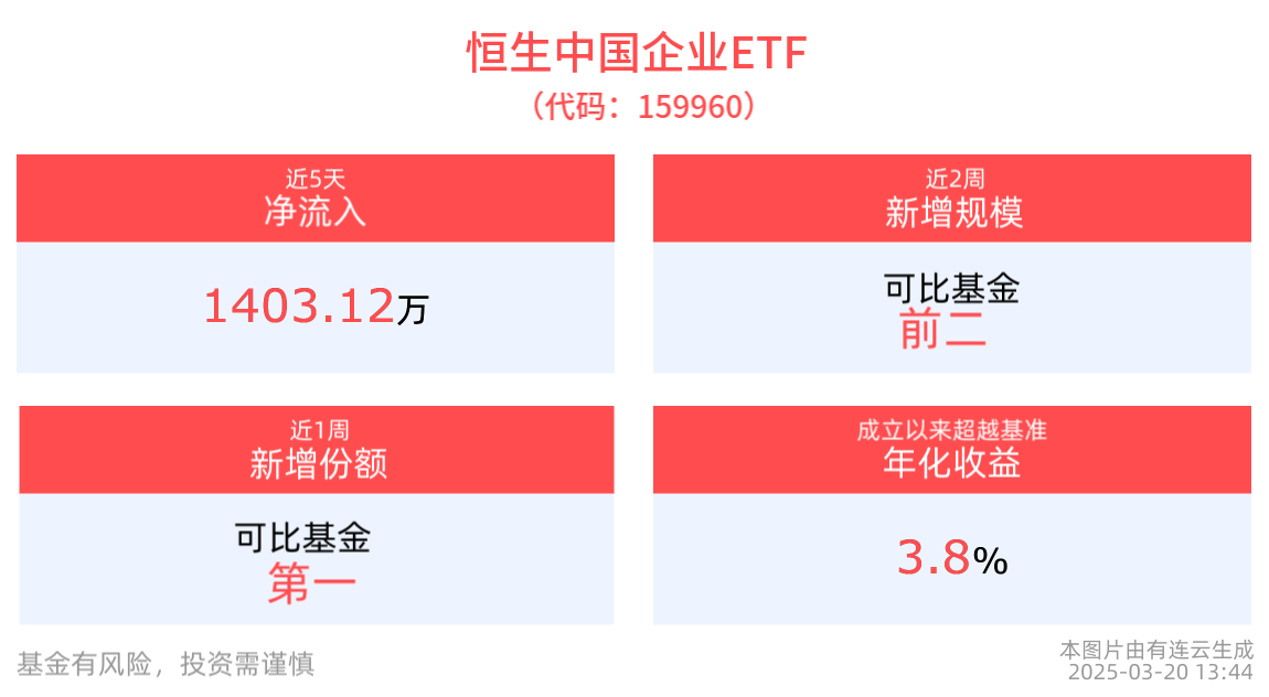 拉长时间看,截至2025年3月19日,恒生中国企业ETF近1周累计上涨5.51%。