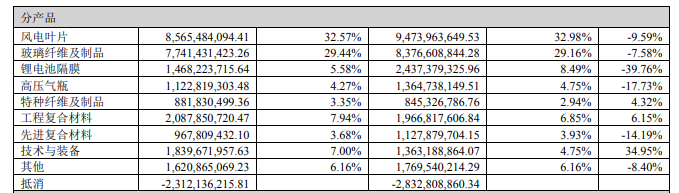 具体产品来看,公司前两大收入来源的营收均同比出现不同程度的减少。报告期内,风电叶片和玻璃纤维及制品占营收比重分别为32.57%、29.44%,营收金额同比下滑9.59%、7.58%。此外,锂电池隔膜产品的营收同比减少近四成。
