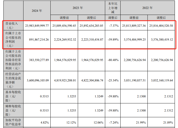 3月19日晚间,中材科技(300942)发布年度报告,公司2024年实现营业收入239.84亿元,同比下降7.37%;归母净利润为8.92亿元,同比下降59.89%;扣非净利润为3.84亿元,同比下降80.48%。