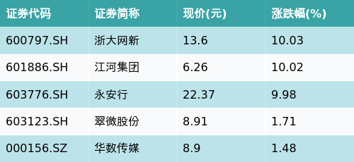截至收盘,蚂蚁金服概念主题涨跌幅最高的五只股票为:浙大网新(600797.SH)、江河集团(601886.SH)、永安行(603776.SH)、翠微股份(603123.SH)与华数传媒(000156.SZ)。详情见下表: