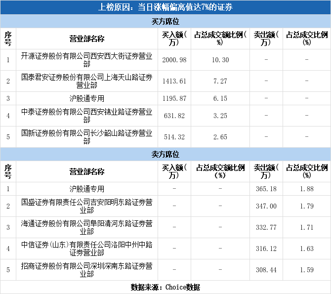 今日龙虎榜单上出现了沪股通的身影,占据了买三、卖一的位置,净买入830.69万元,占当日成交总额的4.27%。