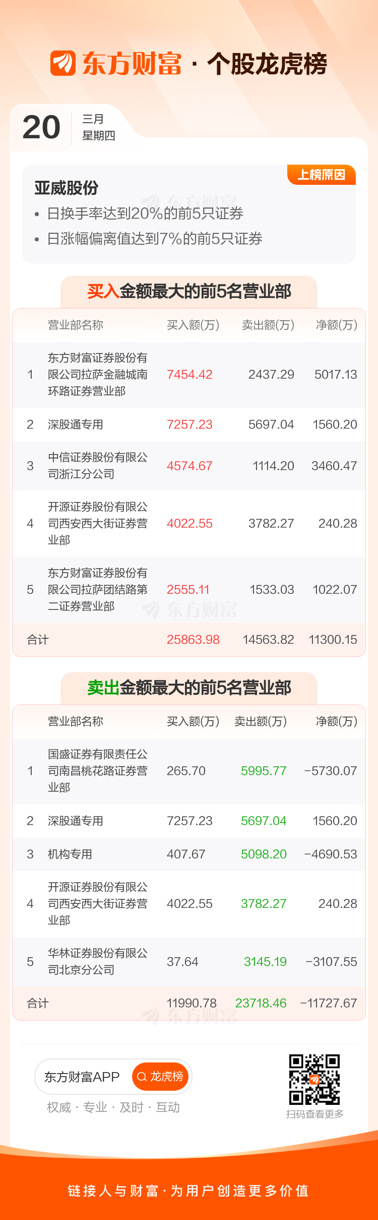 交易所2025年3月20日公布的交易公开信息显示,亚威股份因成为日换手率达到20%的前5只证券、日涨幅偏离值达到7%的前5只证券、连续三个交易日内,涨幅偏离值累计达到20%的证券上榜。亚威股份当日收报13.12元,涨跌幅9.97%,偏离值42.45%,换手率42.44%,成交额26.31亿。异常期间3月18日至3月20日,期间涨幅23.77%,累计偏离值24.28%,区间成交额66.22亿。