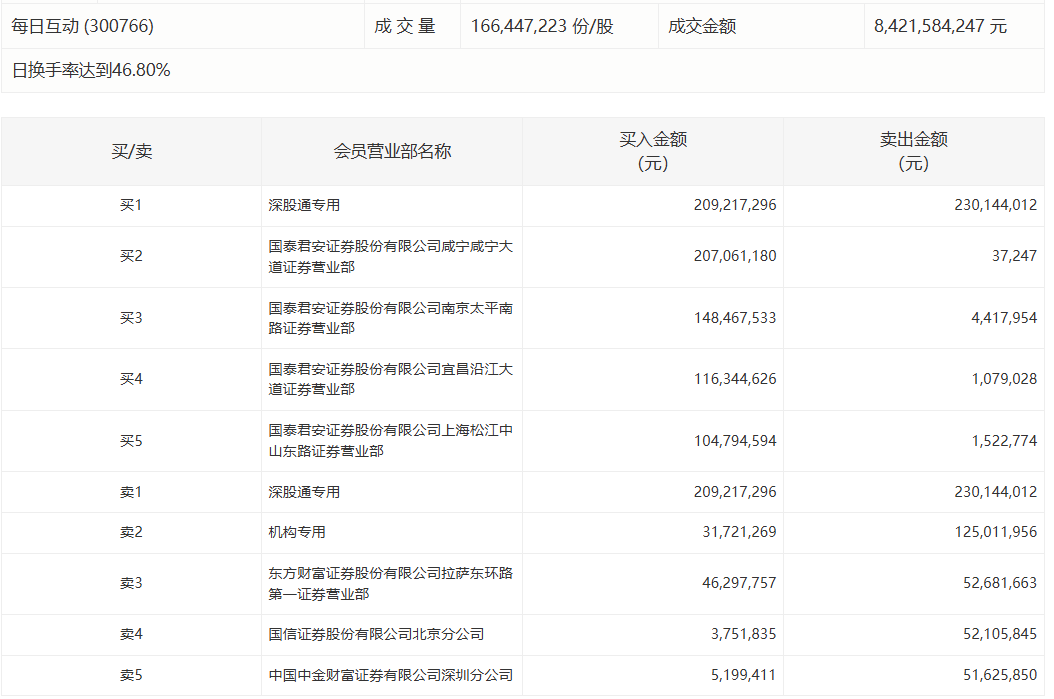 每日互动今日涨17.61%,成交额84.22亿元,换手率46.80%,盘后龙虎榜数据显示,深股通专用席位买入2.09亿元并卖出2.30亿元,有1家机构专用席位净卖出9329.07万元。