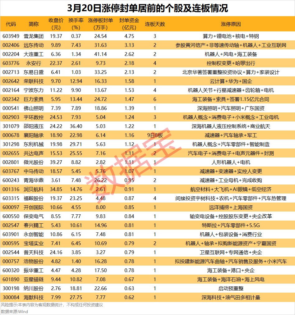 3月20日,A股三大股指全天窄幅震荡调整,截至收盘沪指跌0.51%,深成指跌0.91%,创业板指跌1%。市场收盘共73股涨停(其中包含11只ST股),34股封板未遂,整体封板率为68%。