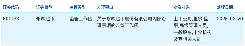 据上交所网站3月20日消息,当日上交所对永辉超市股份有限公司内部治理事项下发监管工作函,涉及对象包括上市公司、董监高、一般股东、中介机构及其相关人员。