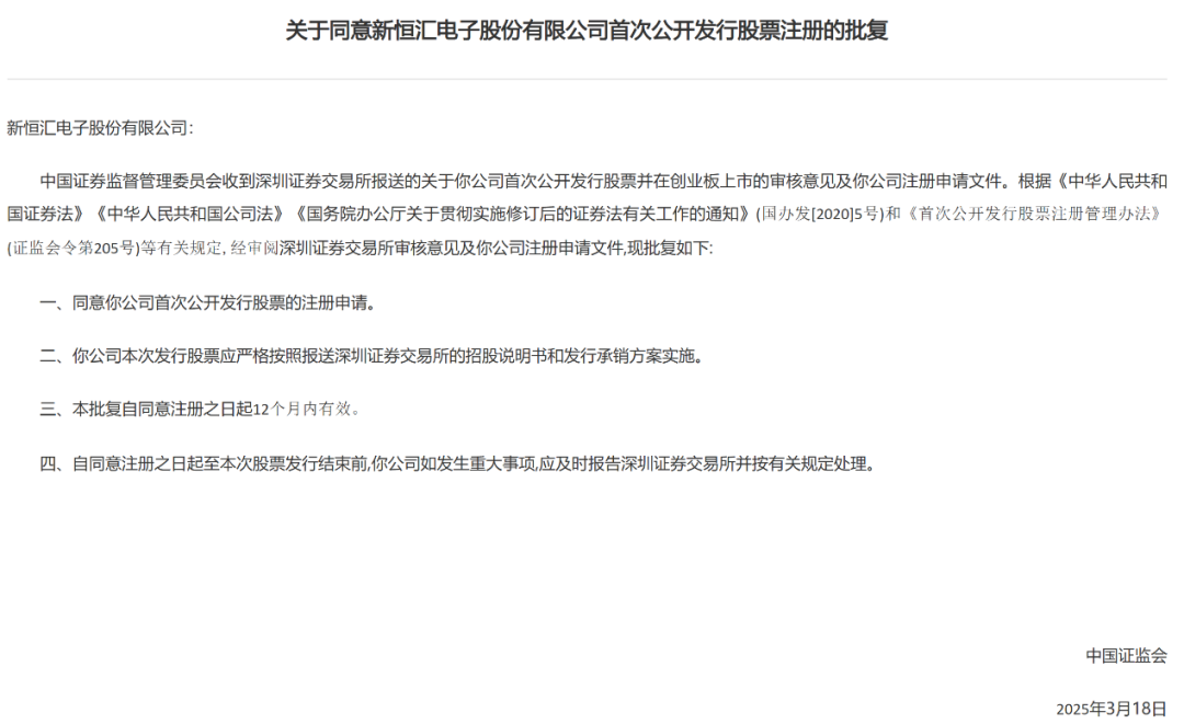 3月20日晚,证监会官网发布了《关于同意新恒汇电子股份有限公司首次公开发行股票注册的批复》。