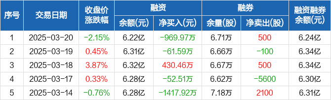 融资方面,当日融资买入3170.89万元,融资偿还4140.87万元,融资净偿还969.97万元。融券方面,融券卖出500股,融券偿还0股,融券余量6.71万股,融券余额232.17万元。融资融券余额合计6.24亿元。