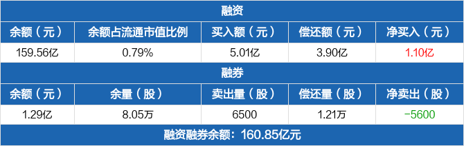 融资方面,当日融资买入5.01亿元,融资偿还3.9亿元,融资净买入1.1亿元,净买入额两市排名第15。融券方面,融券卖出6500股,融券偿还1.21万股,融券余量8.05万股,融券余额1.29亿元。融资融券余额合计160.85亿元。