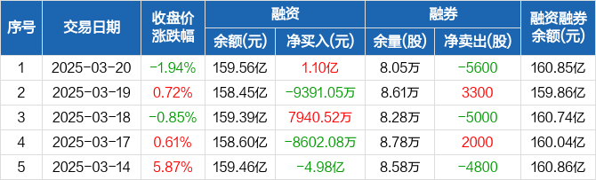 贵州茅台融资融券信息显示,2025年3月20日融资净买入1.1亿元;融资余额159.56亿元,较前一日增加0.7%。