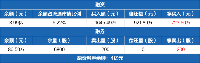融资方面,当日融资买入1645.49万元,融资偿还921.89万元,融资净买入723.6万元。融券方面,融券卖出200股,融券偿还0股,融券余量6800股,融券余额86.5万元。融资融券余额合计4亿元。