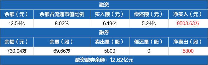 融资方面,当日融资买入6.19亿元,融资偿还5.24亿元,融资净买入9503.63万元。融券方面,融券卖出5800股,融券偿还0股,融券余量69.66万股,融券余额730.04万元。融资融券余额合计12.62亿元。