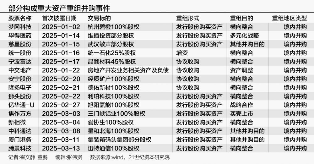 进入2025年后,市场热度依旧。截至3月14日,相关重大资产重组案例已经达到33起,较2024年同期的21起增长57.14%,且项目大多涉及半导体、新能源、人工智能等新质生产力领域。