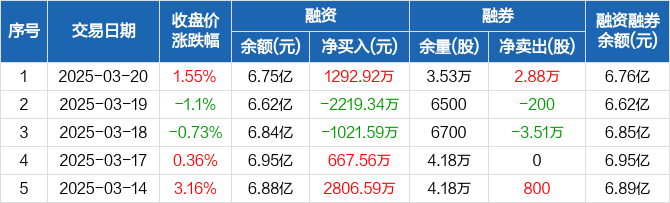 融资方面,当日融资买入6912.86万元,融资偿还5619.94万元,融资净买入1292.92万元。融券方面,融券卖出2.88万股,融券偿还0股,融券余量3.53万股,融券余额48.43万元。融资融券余额合计6.76亿元。