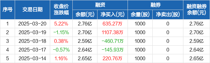 融资方面,当日融资买入5408.02万元,融资偿还4772.75万元,融资净买入635.27万元。融券方面,融券卖出0股,融券偿还0股,融券余量1000股,融券余额5440元。融资融券余额合计2.76亿元。