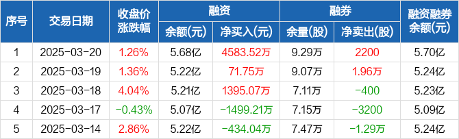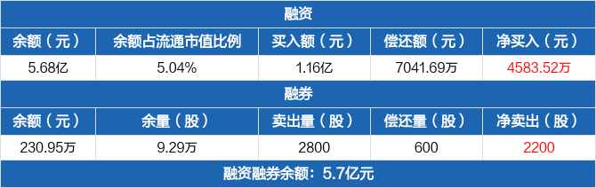 融资方面,当日融资买入1.16亿元,融资偿还7041.69万元,融资净买入4583.52万元,连续3日净买入累计6050.33万元。融券方面,融券卖出2800股,融券偿还600股,融券余量9.29万股,融券余额230.95万元。融资融券余额合计5.7亿元。