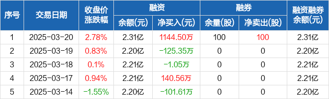 融资方面,当日融资买入2005.57万元,融资偿还861.07万元,融资净买入1144.5万元,净买入额创12个月新高。融券方面,融券卖出100股,融券偿还0股,融券余量100股,融券余额998元。融资融券余额合计2.31亿元。