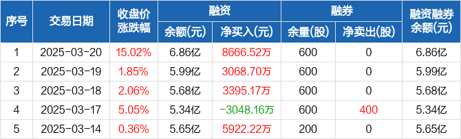 融资方面,当日融资买入4.04亿元,融资偿还3.17亿元,融资净买入8666.52万元,净买入额创历史新高,连续3日净买入累计1.51亿元。融券方面,融券卖出0股,融券偿还0股,融券余量600股,融券余额4182元。融资融券余额合计6.86亿元。
