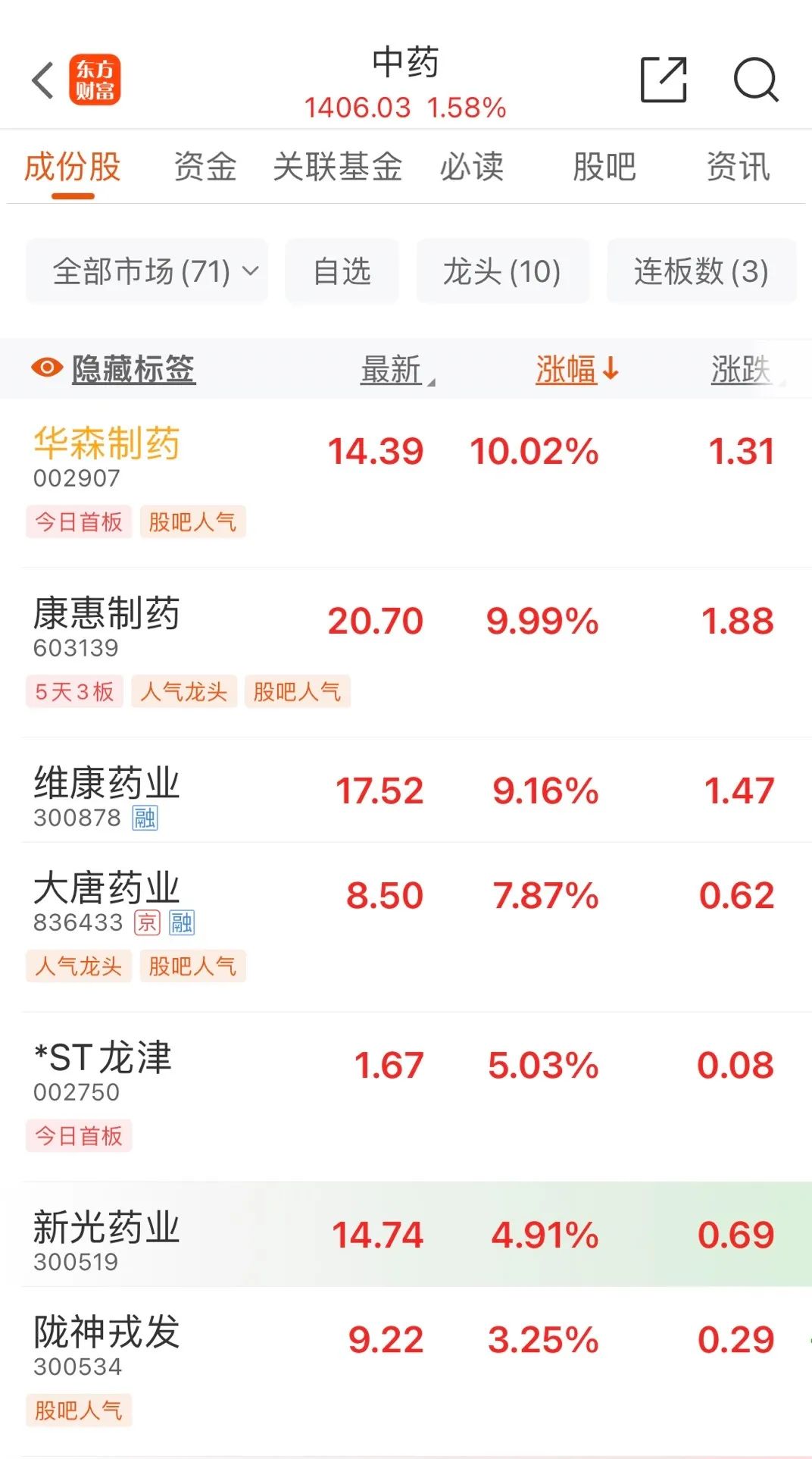 3月21日,中药板块集体高开,重庆华森制药股份有限公司(简称“华森制药”,证券代码:002907)、陕西康惠制药股份有限公司(简称“康惠制药”,证券代码:603139)涨停,浙江维康药业股份有限公司(简称“维康药业”,证券代码:300878)、内蒙古大唐药业股份有限公司(简称“大唐药业”,证券代码:836433)等多只个股涨逾5%,中药板块多只个股股价飘红。