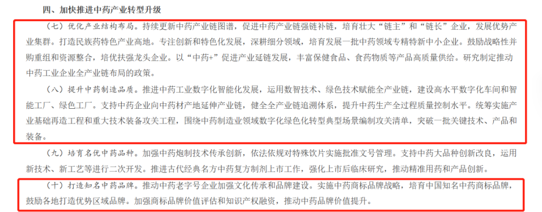 其中,在加快推进中药产业转型升级方面,《意见》提出,持续更新中药产业链图谱,促进中药产业链强链补链,培育壮大“链主”和“链长”企业,发展优势产业集群。打造民族药特色产业高地。专注创新和特色化发展,深耕细分领域,培育发展一批中药领域专精特新中小企业。鼓励战略性并购重组和资源整合,培优扶强龙头企业。以“中药+”促进产业延链发展,丰富保健食品、食药物质等产品高质量供给。研究制定推动中药工业企业全产业链布局的政策。