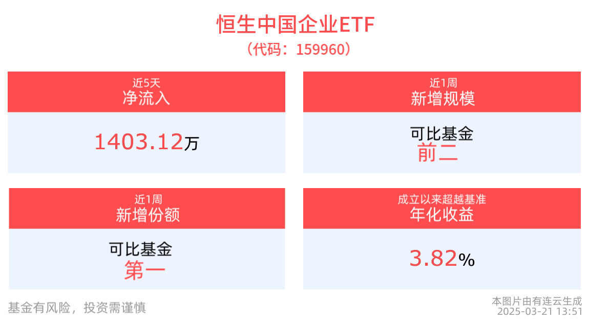 拉长时间看,截至2025年3月20日,恒生中国企业ETF近1周累计上涨3.48%。