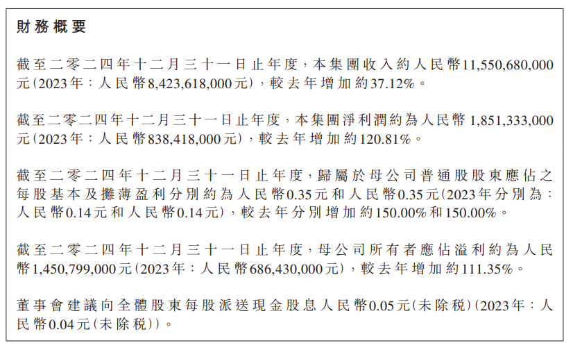 财务回顾方面,销售成本也显著增加,从2023年的50.53亿元上升至2024年的70.29亿元,增幅约为39.09%,主要由于销售量的增加。毛利则从33.7亿元上升至45.22亿元,毛利率略微下降至39.15%。其他收入及收益约为5.83亿元,主要受金融工具结算利得增加影响。整体上,公司的财务状况显示出强劲的增长势头。
