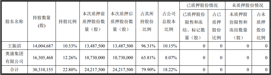 截至公告披露日,控股股东、实际控制人王振滔先生及其一致行动人奥康集团所持股份质押情况如下图:
