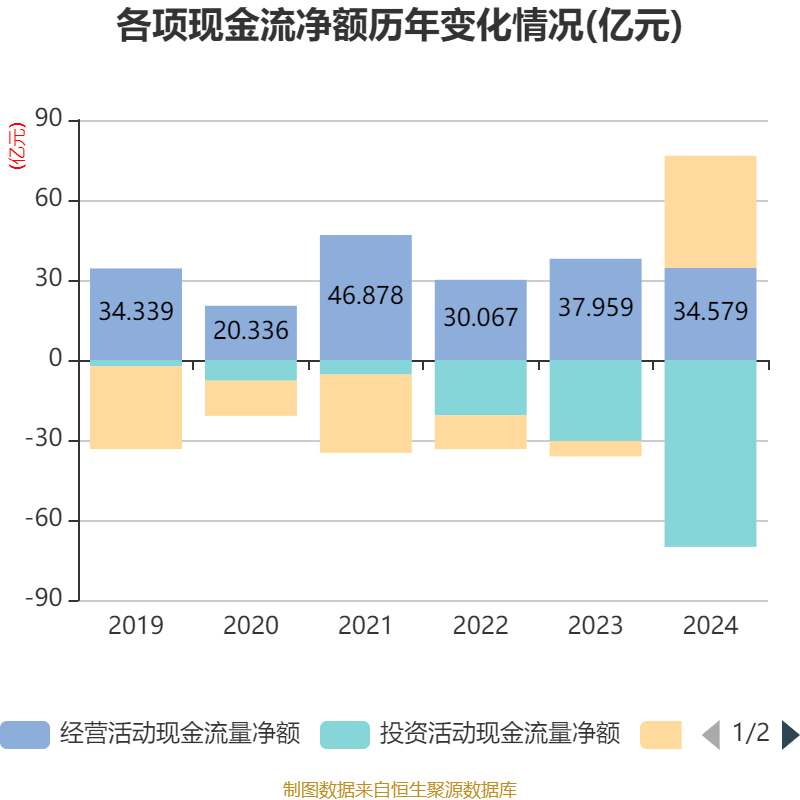 截至2024年,公司经营活动现金流净额为34.58亿元,同比下降8.91%;筹资活动现金流净额42亿元,同比增加47.75亿元;投资活动现金流净额-70.07亿元,上年同期为-30.39亿元。