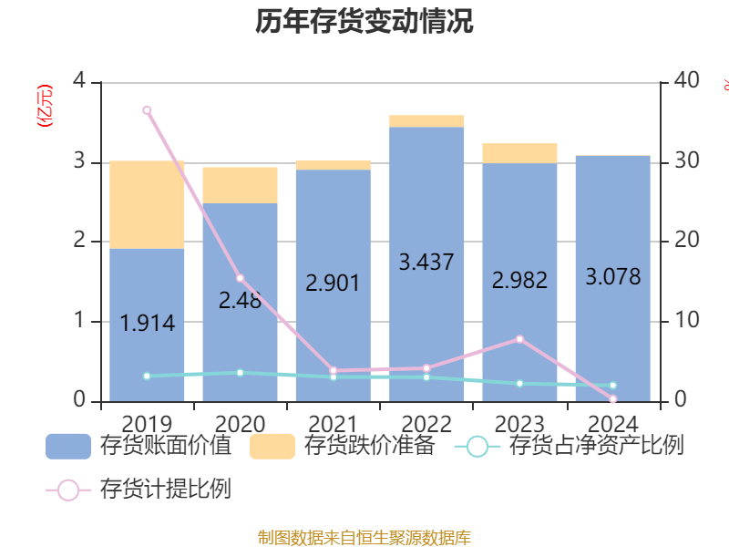 从存货变动来看,截至2024年末,公司存货账面价值为3.08亿元,占净资产的1.98%,较上年末增加957.64万元。其中,存货跌价准备为84.95万元,计提比例为0.28%。