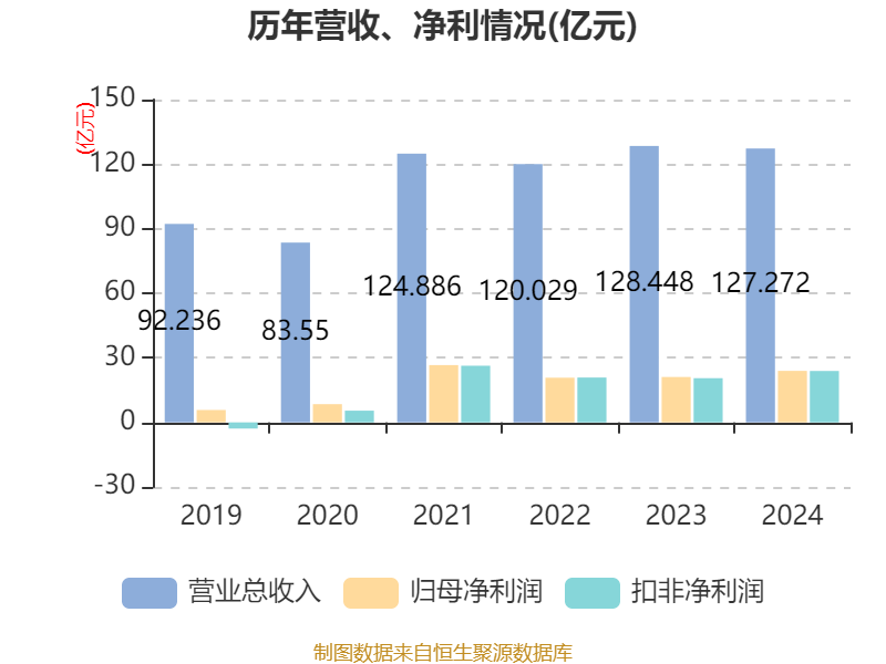 中证智能财讯新集能源(601918)3月22日披露2024年年度报告。2024年,公司实现营业总收入127.27亿元,同比下降0.92%;归母净利润23.93亿元,同比增长13.44%;扣非净利润23.88亿元,同比增长16.30%;经营活动产生的现金流量净额为34.58亿元,同比下降8.91%;报告期内,新集能源基本每股收益为0.924元,加权平均净资产收益率为16.46%。公司2024年度分配预案为:拟向全体股东每10股派现1.6元(含税)。