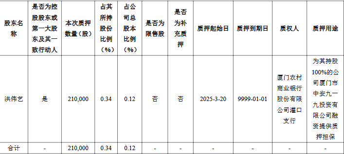 3月21日,国安达(300902)发布公告,控股股东洪伟艺于2025年3月20日质押了部分股份,质押情况如下所示: