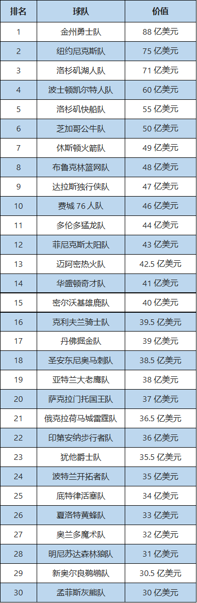 NBA球队价值排名(来源:福布斯杂志2024年)