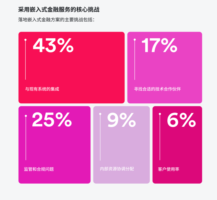 调研显示,51%的受访企业认为,嵌入式金融的实际效果与预期存在差距,而这种差距可以通过更清晰地沟通和选择合适的供应商来消除。尽管嵌入式金融技术潜力巨大,但设定合理的预期才是成功的基础,这有助于避免客户接受速度慢、内部支持不足等问题。