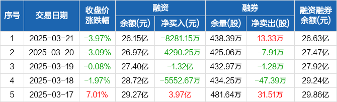 融资方面,当日融资买入2.09亿元,融资偿还2.92亿元,融资净偿还8281.15万元,连续4日净偿还累计3.13亿元。融券方面,融券卖出25万股,融券偿还11.67万股,融券余量438.39万股,融券余额4879.25万元。融资融券余额合计26.63亿元。