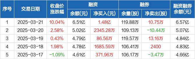 融资方面,当日融资买入2.11亿元,融资偿还6221.51万元,融资净买入1.48亿元,净买入额创12个月新高,净买入额两市排名第四,连续5日净买入累计1.93亿元。融券方面,融券卖出11.24万股,融券偿还4900股,融券余量119.88万股,融券余额630.57万元。融资融券余额合计6.57亿元。