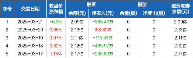融资方面,当日融资买入3173.97万元,融资偿还3542.46万元,融资净偿还368.49万元。融券方面,融券卖出0股,融券偿还0股,融券余量0股,融券余额0元。融资融券余额合计2.09亿元。